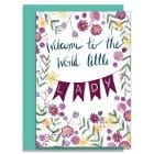 Welcome to the world little lady greeting card with illustrated purple and yellow flowers and bunting.